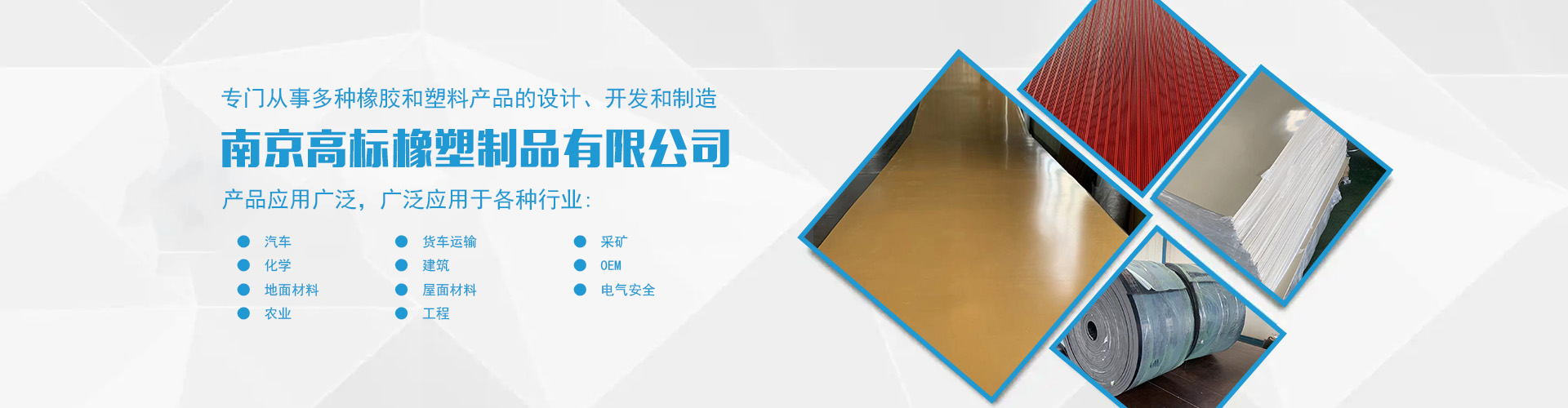 南京高標橡塑制品有限公司是一家專業(yè)的橡膠板、橡膠制品和熱塑性塑料產(chǎn)品的制造商。主營產(chǎn)品:三元乙丙橡膠板,丁腈橡膠版,氯丁橡膠板,丁苯橡膠板,丁基橡膠板,天然橡膠板,硅橡膠板,氟橡膠板,絕緣,防靜電,導電橡膠板,夾布,夾金屬網(wǎng)橡膠板,耐酸堿橡膠板,耐油橡膠板,耐磨橡膠板,阻燃橡膠板,阻尼橡膠板,減震橡膠板,防滑橡膠板,橡膠墊片等。 高標橡塑專門從事多種橡膠和塑料產(chǎn)品的設(shè)計、開發(fā)和制造。我們的產(chǎn)品應用廣泛。廣泛應用于各種行業(yè),包括:汽車,貨車運輸,采礦,化學,建筑,OEM,地面材料,屋面材料,電氣安全,農(nóng)業(yè),工程等。 高標橡塑的客戶服務(wù)于許多行業(yè),包括墊片切割、分銷商、工業(yè)用品零售商和批發(fā)商。自